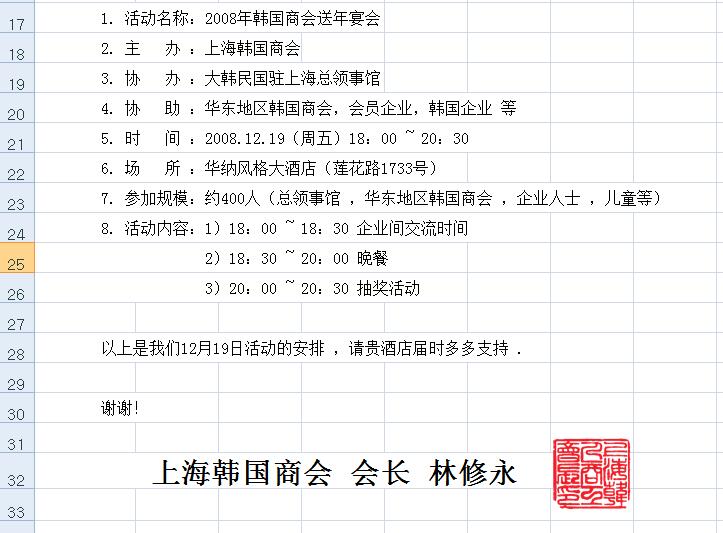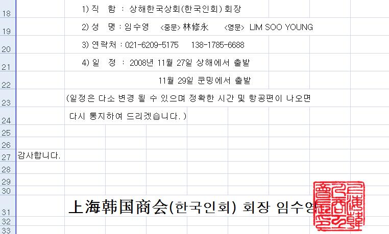 2008년11월27일 중국한국상회 주최 지역상회 회장단 전체회의 운영위원회 참석 공문, 임수영 화동연합회 회장, 상해한국상회 회장 참석, 운남성 쿤밍 곤명 개최.